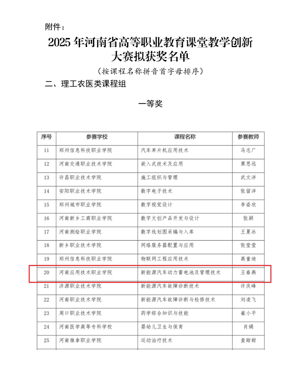 2025年河南省高等职业教育课堂教学创新大赛(理工农医类)评选结果揭晓,威廉官网教师王春燕在激烈竞争中脱颖而出,荣获省级一等奖。此次大赛汇聚了全省101所院校193名教师同台竞技,充分展现了我省职业教育课堂改革的丰硕成果。