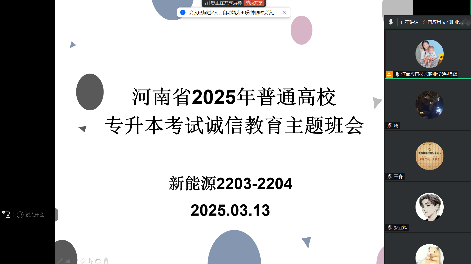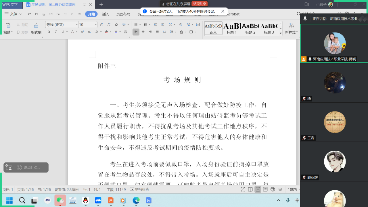为深入贯彻落实国家教育考试相关规定,强化专升本考生诚信意识,保障考试公平公正,威廉官网中国官方网站于3月13组织全体专升本考生召开“诚信应考·笃行致远”主题班会。考虑到专升本考生正处于紧张备考状态,本次班会决定采取线上形式开展。会议围绕考试纪律、物品准备及“无声入场”规范展开全方位指导,全体考生在线参会,确保考前准备“零疏漏”、诚信教育“全覆盖”。