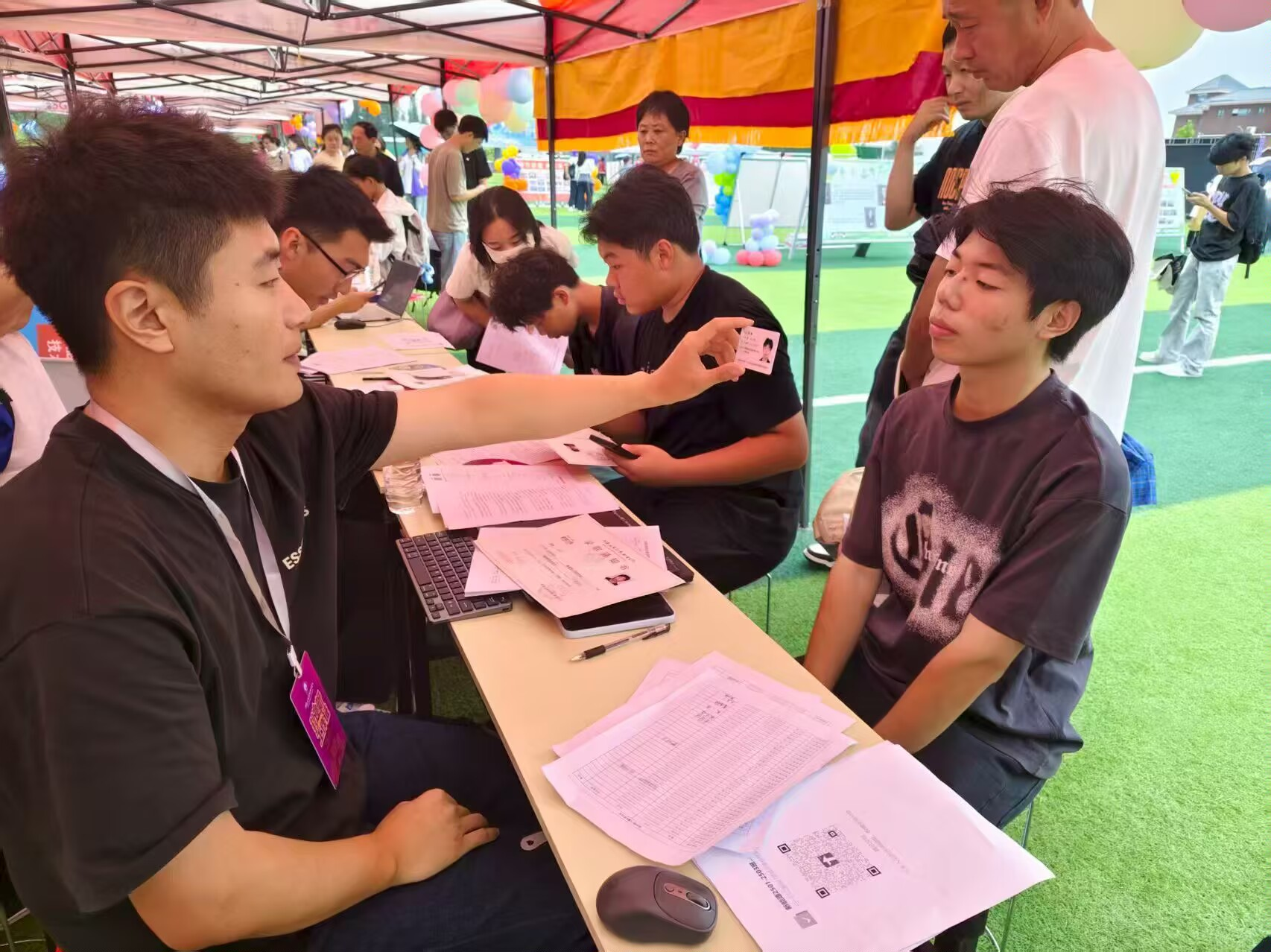 迎新现场气氛热烈,校党委书记闫俊山专程深入迎新一线,实地督导迎新工作开展。期间,学院党总支书记孙丽娜与副院长仵征共同向闫俊山详细汇报迎新工作,逐一说明细节;同时结合实时数据,汇报当日迎新进展,包括已报到新生人数、及新生和家长对现场服务的反馈意见。闫俊山对学院迎新工作的周密部署和高效推进给予肯定。