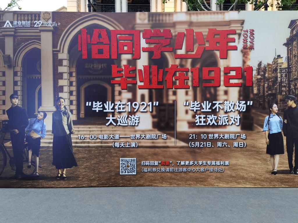 “恰同学少年 毕业在1921”是建业电影小镇专门针对2021届大学毕业生而举办的毕业狂欢盛典,通过让学生参加超热血的青年大巡游,穿越时光,回到一百年前和青年榜样一起为梦想呐喊等活动,让学生沉浸其中,激发学生的爱国热情、展现大学生的精神面貌和时代担当。