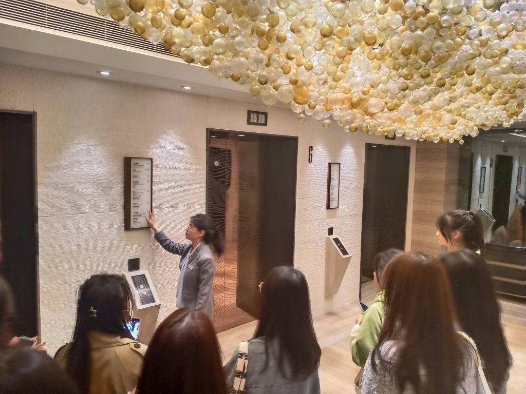 随后,学生分成两组,参观酒店的27层行政楼层、阿米奇意大利餐厅、豫园中餐厅、健身中心等。带领参观的工作人员是pg国际优秀毕业生和在岗实习生,她们亲切友好、热情细致地讲解介绍,用自己的亲身经历和自我见解为学生们答疑解惑,相处十分融洽。