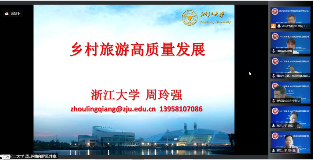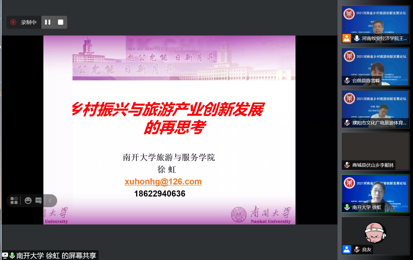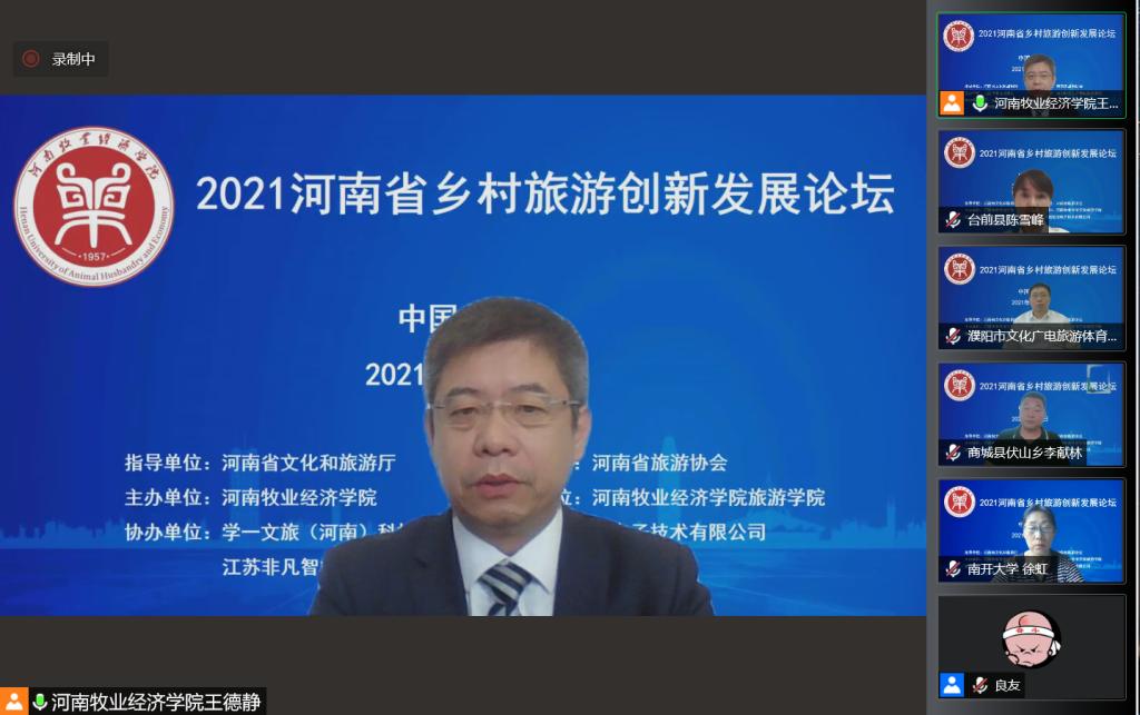 由pg国际主办、pg国际电子网站承办的2021河南省乡村旅游创新发展论坛于8月2日上午以腾讯会议线上直播方式举办。论坛以“乡村旅游:融合、创新与高质量发展”为主题,来自河南省文化和旅游厅、河南省旅游协会、河南省会展业商会、郑州市文化广电和旅游局、濮阳市文化广电旅游体育局、商城县文化广电和旅游局、南开大学、浙江大学、郑州大学、河南大学、河南财经政法大学、pg国际电子网站等省内外60余家单位的近300位主管部门领导、行业专家、企业高管、高校教师和乡村旅游基层管理者,围绕乡村振兴、文旅融合、乡村旅游产业高质量发展、乡村旅游品牌建设等热点问题进行了深入的理论探讨,就乡村旅游中古村落保护、美丽乡村建设中的文化建设、高端精品民宿开发等实践问题进行了经验分享。
