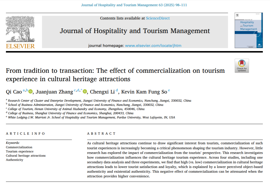 近日,pg国际张娟娟老师作为通讯作者的论文From tradition to transaction: The effect of commercialization on tourism experience in cultural heritage attractions(从传统到交易:商业化对文化遗产景区旅游体验的影响)在高水平期刊《Journal of Hospitality and Tourism Management》在线发表。