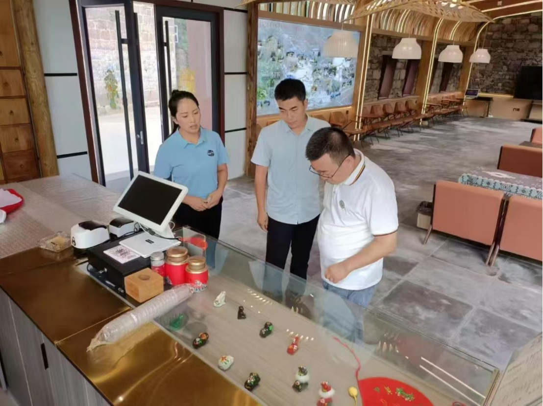 张众教授在当地文旅部门工作人员和民宿主人陪同下,对云腾文旅公司现有的文旅文创产品进行了查看,并与工作人员进行了充分的讨论。双方均认为民宿所在地域有较强的历史文化,但文化要素与旅游产品的融合不足,尤其是现有旅游产品与其他地区的产品较为相似,且制作工艺较为粗糙,缺少代表当地文化的特色产品,需要进一步研究。张教授对民宿旅游产品的设计和制作给出专业意见,并提出除了工艺产品,特色农产业也是重点开展的方向,获得企业管理层的认可。