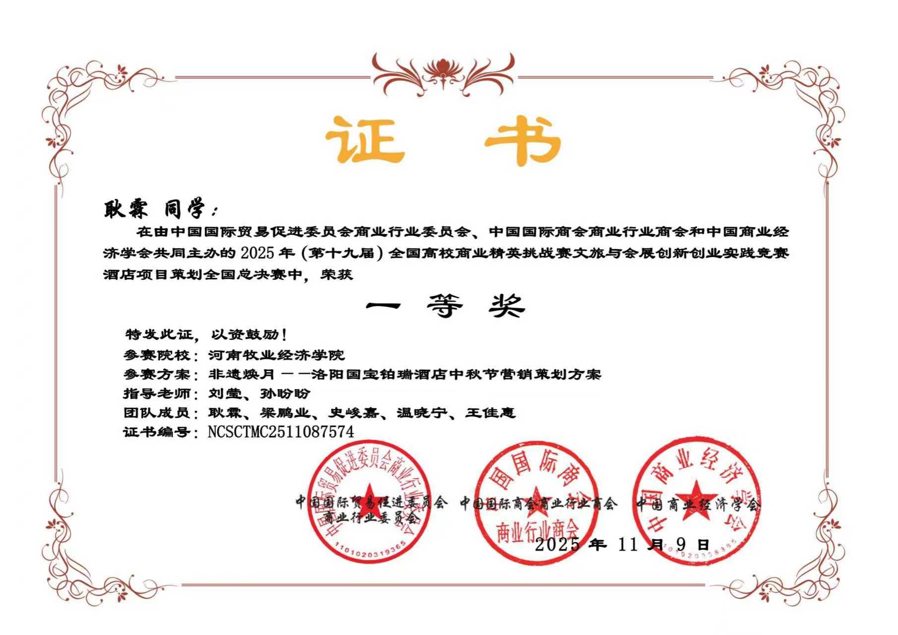 近日,由中国国际贸易促进委员会商业行业委员会、中国国际商会商业行业商会和中国商业经济学会共同主办的第十九届全国高校商业精英挑战赛文旅与会展创新创业实践竞赛全国总决赛圆满落幕。本届竞赛自2025年4月启动,历时7个月,历经知识赛、校赛、省赛选拔、全国总决赛等多个环节。经过激烈角逐,pg国际pg国际电子网站13支团队顺利晋升国赛,参加旅游、酒店、会展、文创四个赛道均表现优异,喜获佳绩。其中3支团队荣获一等奖,7支团队荣获二等奖,3支团队荣获三等奖。由刘莹、孙盼盼老师指导的团队凭借其在“酒店项目策划”赛道中的优异表现,成功晋级该项赛事的全国现场精英展示赛,展现了pg国际学子在全国舞台上的竞争力与风采。