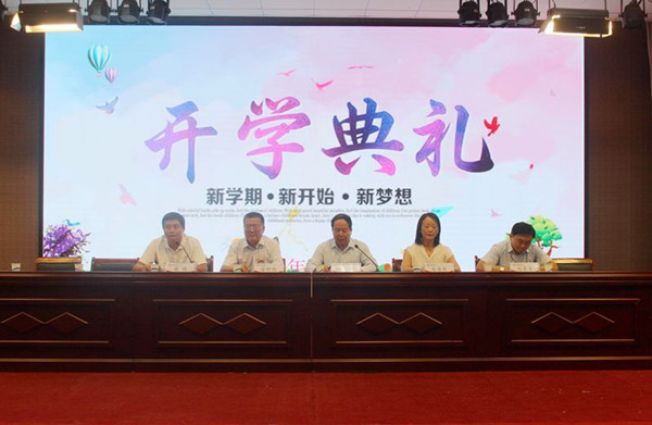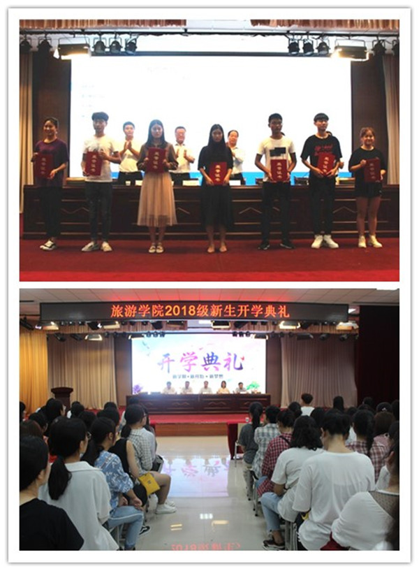 2018年9月10日下午,pg国际电子网站pg国际电子网站2018级新生开学典礼在大学生活动中心隆重举行。出席本次活动的有pg国际电子网站党总支书记李喜民、院长徐新林、党总支副书记陈明、副院长马海燕、副院长赵忠奇、会展专业教研室主任连建功、酒店专业教研室主任张少飞、景区专业教研室主任陈道山、旅游专业教研室主任王中雨、团总支书记祝聪楠和各位辅导员以及部分2017级优秀学生代表、2018级全体新生。