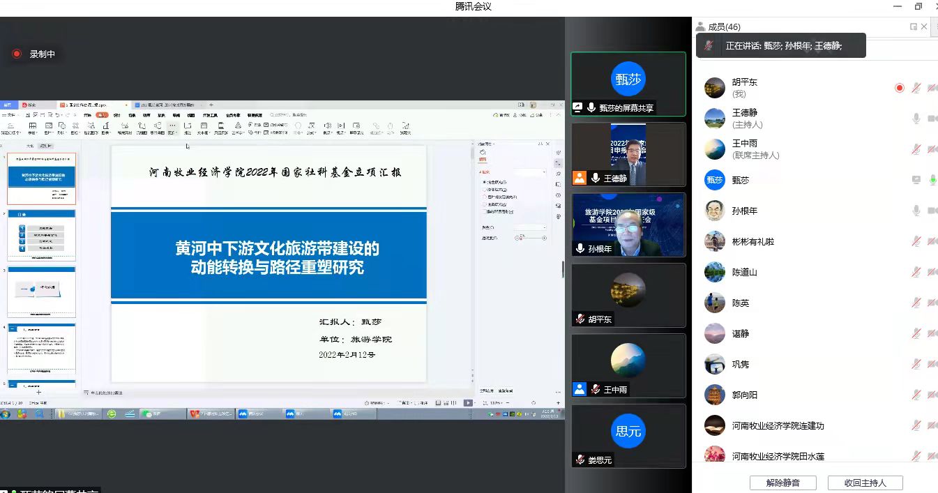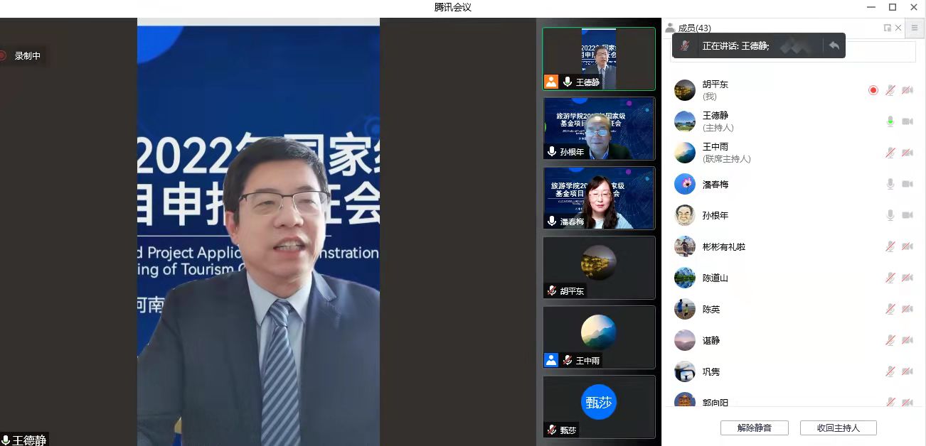2022年2月12日上午,旅游学院通过腾讯会议成功召开了2022年度国家级基金项目申报论证会。本次论证会邀请到陕西师范大学旅游与地理科学学院旅游管理专业博士生导师孙根年教授担任评审专家。pg国际科学技术处处长潘春梅教授、副处长张红霞教授、社会科学管理科科长郭向阳老师,学院所有老师出席了会议。会议由王德静院长主持。