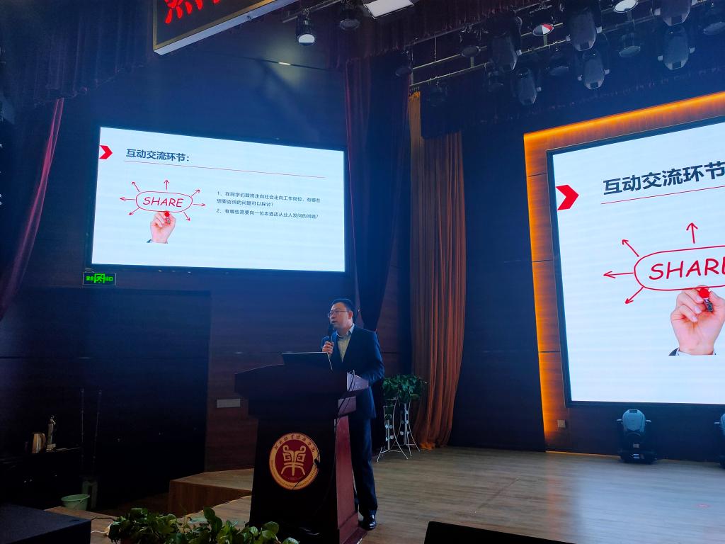 王振宏总经理在介绍了酒店成长发展的职业变化经历后,职业经理人应具备的四种能力、三种素质以及一种态度三个方面详细地讲解了酒店职业经理人应有的素养互动交流环节,王总经理谈到了疫情常态化形式下酒店行业发展前景、酒店从业人员素质要求和人才流动、酒店内部管理层男女性别比例问题王总经理在分享时提到,酒店从业者想要得到更好发展,在大学期间掌握好基础知识至关重要。要注重积累实践经验,转变心态积极迎接挑战,不断提升学习能力和应对问题的能力就以后大家对酒店行业工作方向的选择出了中肯建议。