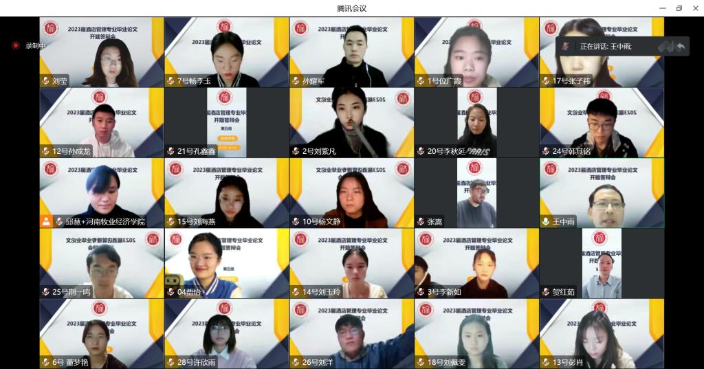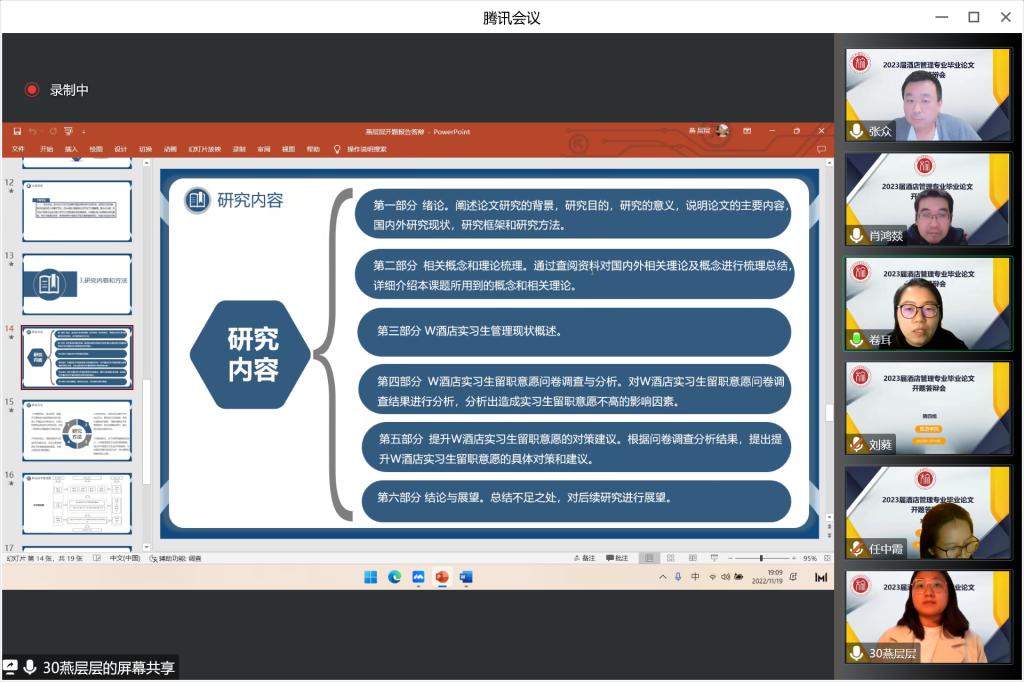 根据《pg国际电子网站本科毕业论文(设计)工作条例》和《pg国际电子网站2023届本科毕业论文(设计)工作实施方案》,pg国际电子网站于11月19日顺利开展2023届酒店管理专业本科毕业论文开题答辩。2019级酒管01班、2021级酒管专升本01、02、03班共207名学生分为7组,通过腾讯会议的线上方式参加答辩。