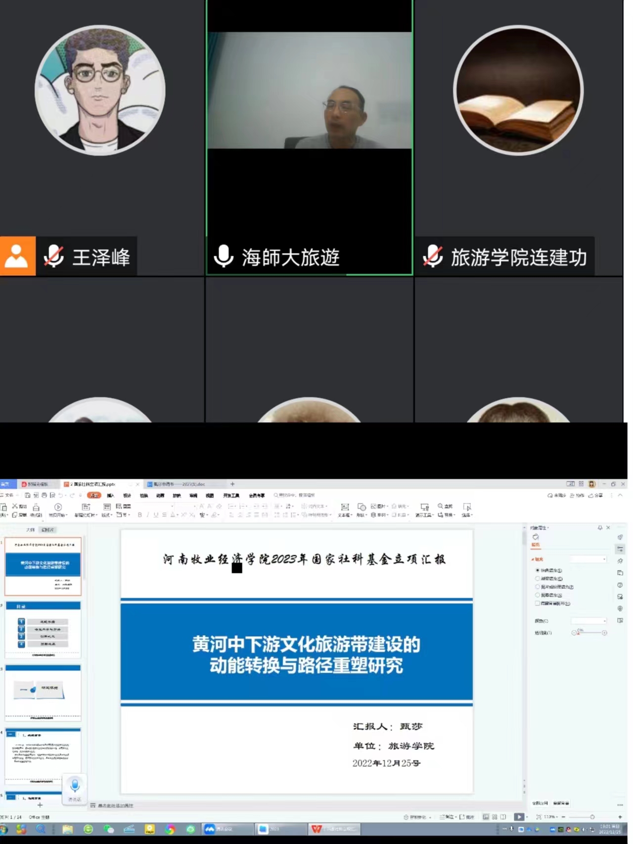 2022年12月25日晚上19:00,pg国际电子网站通过线上会议进行了2023年国家社科基金项目申报首场论证会。本次论证会邀请海南师范大学pg国际电子网站副院长、河南大学商学院旅游管理博士生导师李锋教授在线点评与辅导。学院教研室主任、专任教师、博士们参加了本次论证交流会,会议由副院长陈道山主持。
