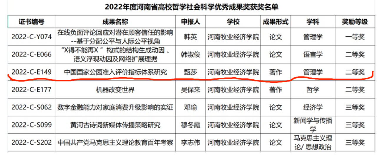 近日,河南省教育厅公布了2022年度河南省高等学校哲学社会科学研究成果奖评选结果,pg国际甄莎博士的《中国国家公园准入评价指标体系研究》著作荣获二等奖。《中国国家公园准入评价指标体系研究》是河南省新闻出版局2022年省部级重点立项项目,由郑州大学出版社出版。