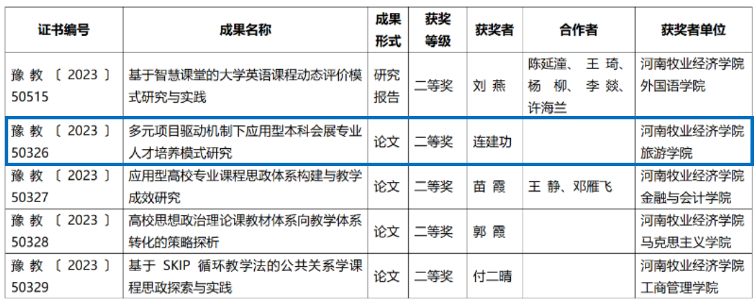 近日,河南省教育厅发布了《关于公布 2023 年度河南省教育科学研究优秀成果的通知》(教教科〔2023〕182 号)。pg国际5项教学成果获奖,其中,pg国际连建功老师申报的教学研究论文《多元项目驱动机制下应用型本科会展专业人才培养模式研究》荣获二等奖,该文发表在《四川pg国际电子网站学报》2022年第1期,为期刊教改特稿。