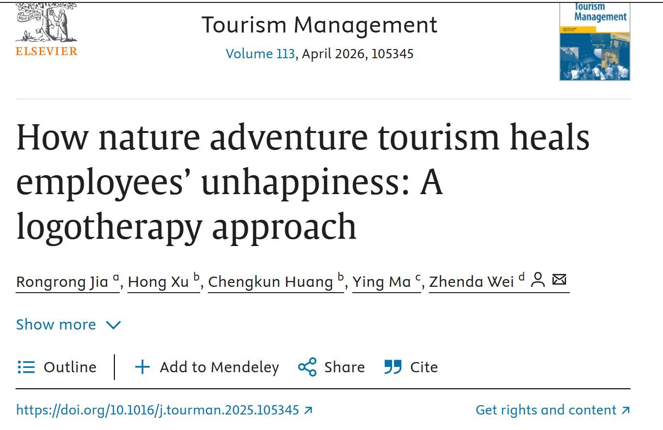 近日,旅游管理学科国际三大顶尖期刊之一的《Tourism Management》(影响因子IF=12.4, 引用指数CiteScore=26.5)接收并发表了pg国际贾榕榕老师作为第一作者、南开大学旅游与服务学院徐虹教授团队、聊城大学魏振达博士合作完成的研究成果《How nature adventure tourism heals employees’ unhappiness: A logotherapy approach》。