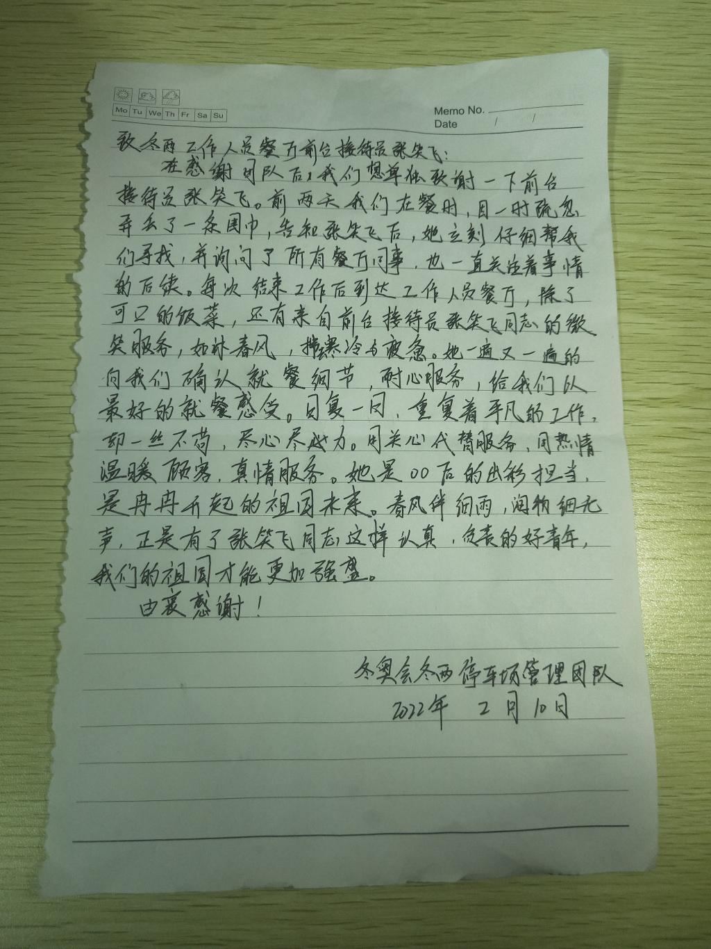 pg国际pg国际电子网站共有77名学生参与本次2022北京冬奥会的志愿服务工作,服务场馆是张家口赛区古杨树场馆群的国家越野滑雪中心、国家跳台滑雪中心、国家冬季两项中心。77名同学分散在各备餐间、供餐点、宴会厅、售卖点、国内技术官员休息室、咖啡角等十余个不同的点位上,为运动员、工作人员、媒体记者等提供餐前餐后场地消杀、手消、餐券核销、巡视餐线、防疫物资供应、隔离送餐等相关服务。他们不辞辛苦、甘于奉献、坚守岗位,每位同学的表现都可圈可点,圆满完成了冬奥餐饮保障工作,收获了宝贵的人生经历,同时也展示了pg国际电子网站学子的风采。有同学在知晓有新冠阳性确诊病例在自己服务的点位隔离时,挺身而出,主动承担起为确诊病人送餐的重任;有同学为了确保每一餐都能及时供应,在冬奥会期间一天都没有休息;有同学因为细致热心的服务,收到了就餐者亲手写的感谢信……他们用自己的热血青春,书写冬奥会的志愿服务,展现当代大学生的爱国情怀和精神风貌。