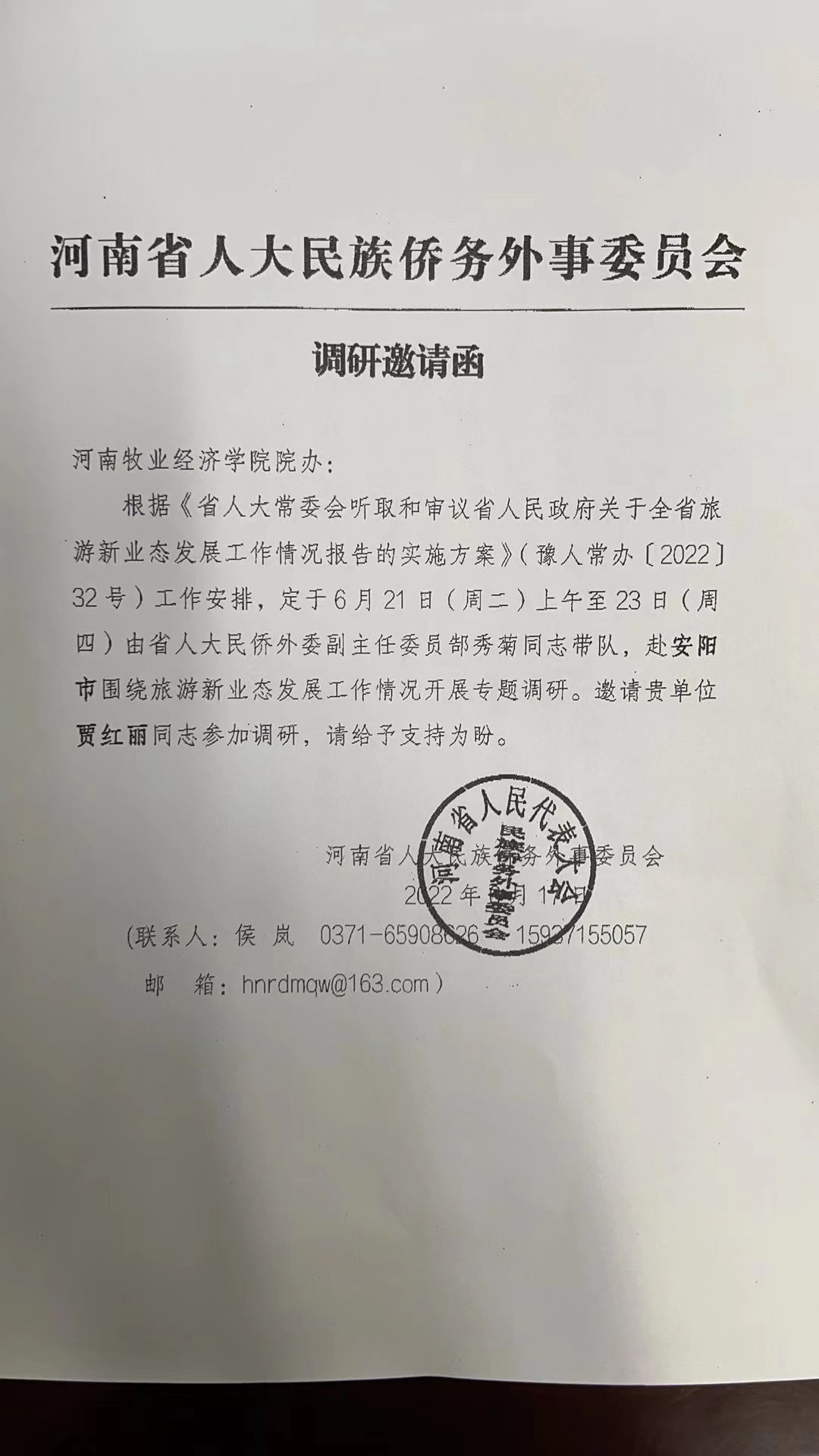 6月21日—23日,应河南省人大民族侨务外事委员会邀请,pg国际贾红丽老师随同省人大常委会调研组走进安阳就旅游新业态发展现状开展为期三天的调研调研组一行先后深入安阳县航空科普馆、林州市石板岩镇等地,实地察看民宿服务、乡村旅游等具有特色的旅游新业态发展工作情况。