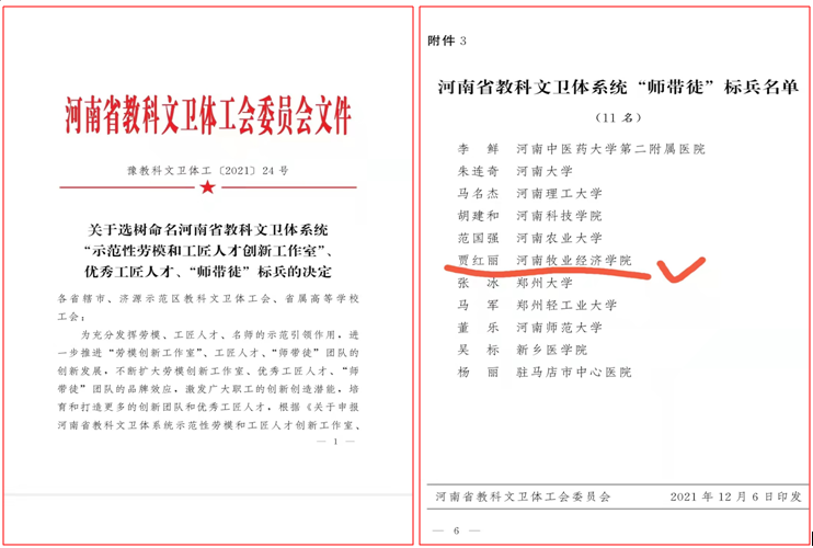 近日,从河南省教科文卫体工会传来喜讯,pg国际贾红丽老师荣获2021年河南省教科文卫体系统示范性“师带徒”标兵荣誉称号,此项殊荣全省仅有11对。