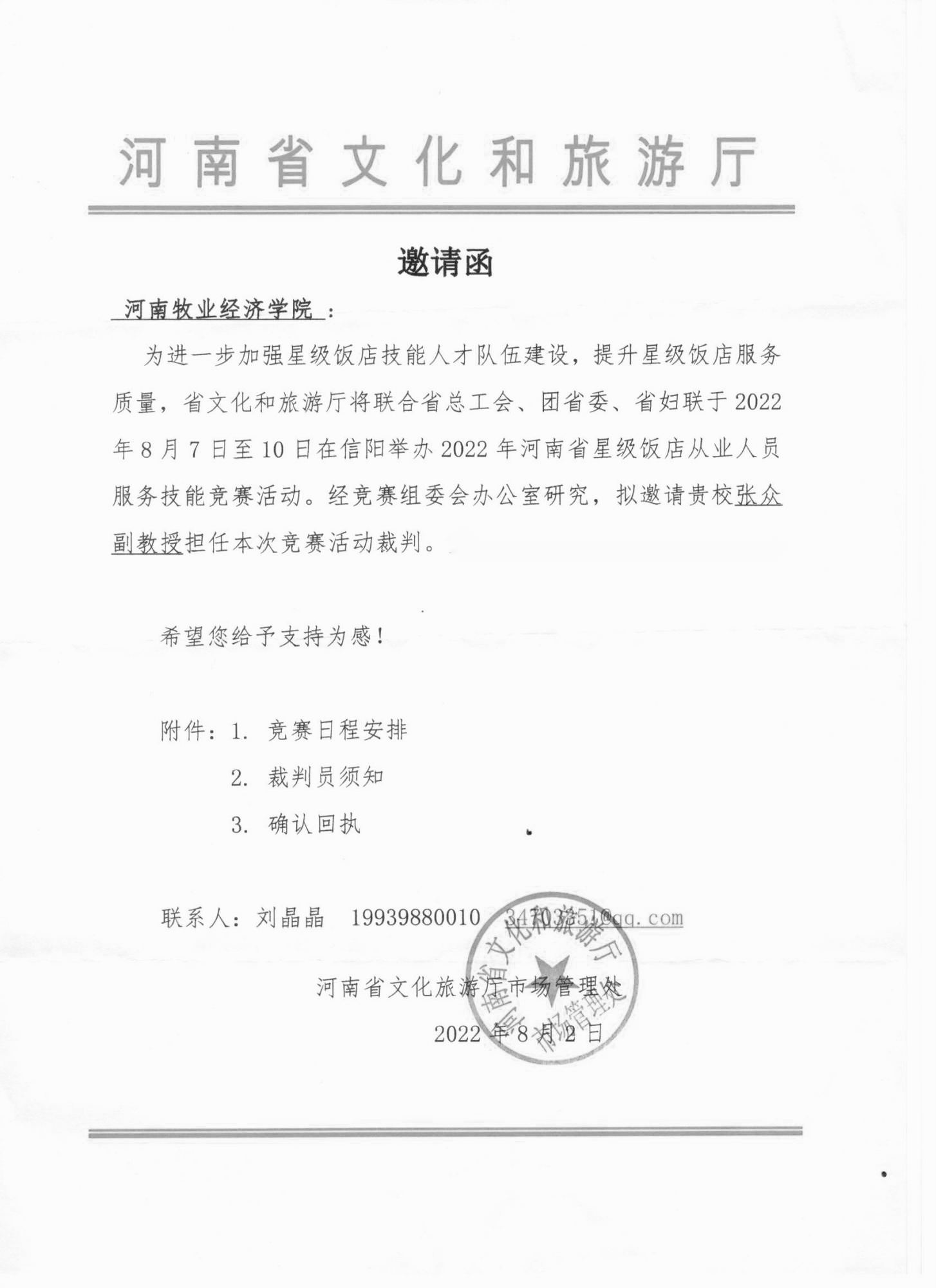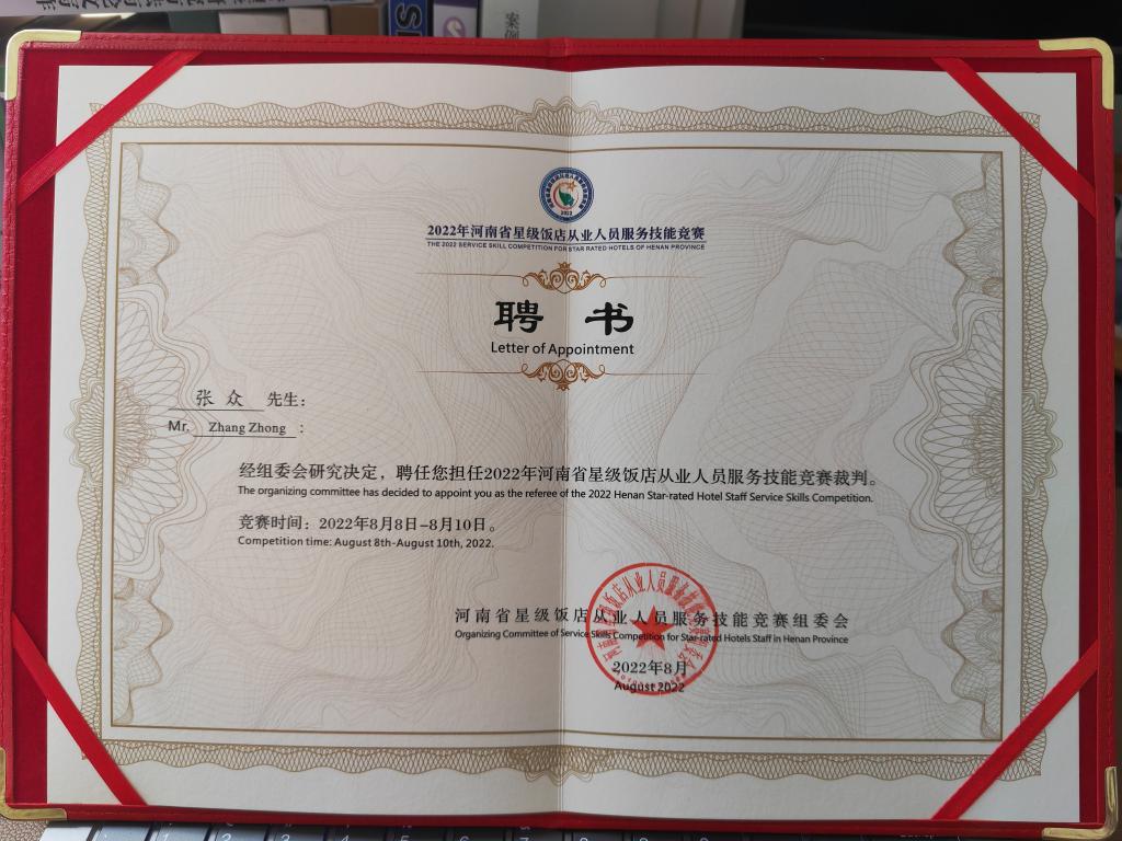 近日,pg国际张众副教授受河南省文化和旅游厅邀请,在刚刚结束的2022年河南省星级饭店从业人员服务技能竞赛中担任裁判员,圆满完成大赛执裁任务。