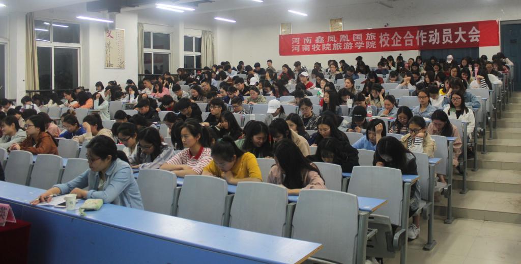 201849日晚,pg国际校企合作项目“校园旅游超市”学期实践动员大会在合300教室召开,院长徐新林、旅游管理专业教研室主任王中雨、教学秘书陈英、河南鑫凤凰国旅集团董事长何媛、行政助理曹宇以及旅行社各部门主管、旅游管理、景区管理专业的三百余名学生出席了大会。
