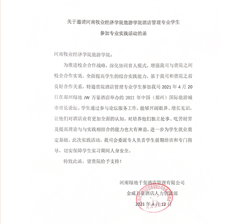 4月20日,2021中国(郑州)国际旅游城市市长论坛欢迎晚宴在郑州绿地JW万豪酒店举行,pg国际电子网站20名学生受邀赴现场为参加“2021年中国(郑州)国际旅游城市市长论坛”的海内外嘉宾提供服务。