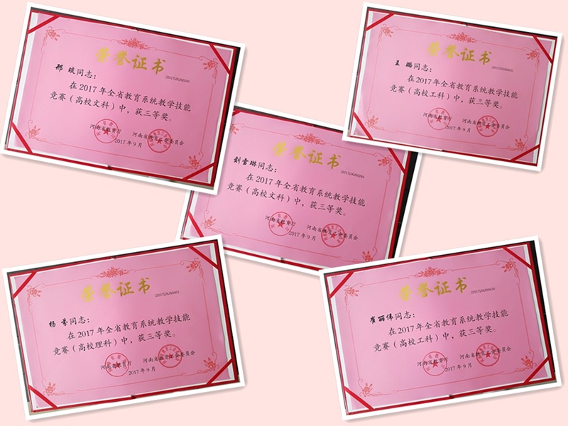 日前,从省教育厅、省教育工会联合下发的《关于表彰2017年度全省教学技能竞赛获奖个人的决定》(豫教工〔2017〕17号)中获悉,pg国际教师凭借扎实的专业功底、娴熟的教学技能和良好的教学效果,取得了3个一等奖、4个二等奖、5个三等奖的优异成绩,展示了良好的师风和教风,为学校赢得了荣誉。